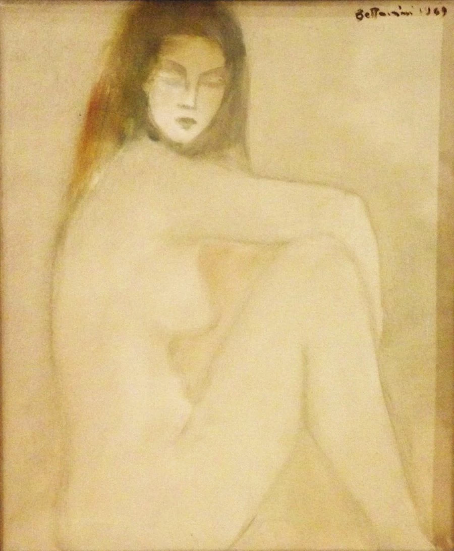 Grazie all’uso di colori dai toni caldi e semplici tratti, Bettarini raffigura in quest’olio su tela è un bellissimo nudo di donna