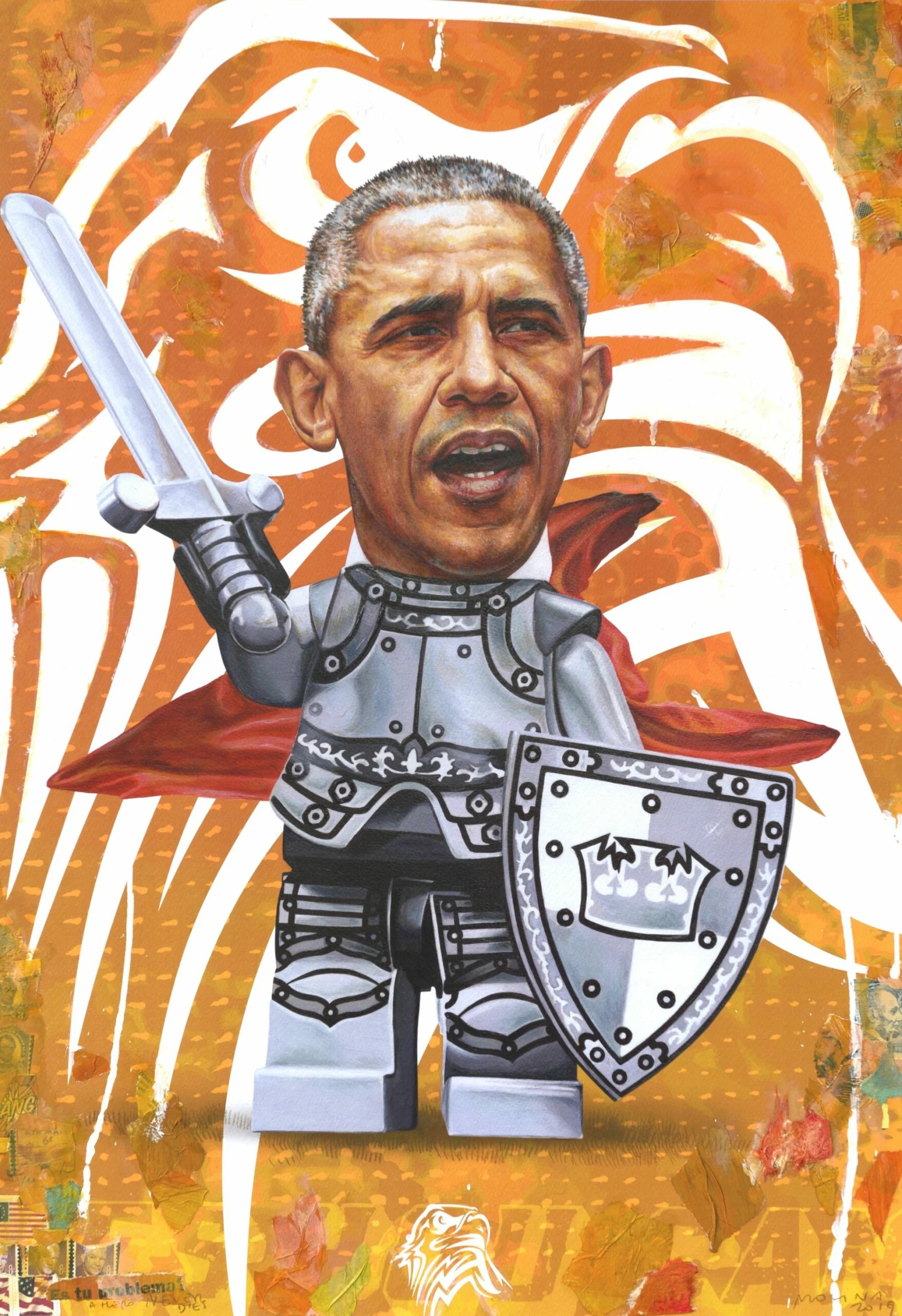 Nell’opera Obama – Aquila, José Molina riprende il volto del l’ex presidente americano Barack Obama in modo ironico. Utilizzando sempre il gioco come linea di congiunzione, l’ex presidente, indossa i panni di un cavaliere con spada e armatura su uno sfondo nei toni dell’arancione con un’enorme sagoma di testa di aquila alle sue spalle. L’animale infatti è diventato un simbolo molto forte che rappresenta l’America.