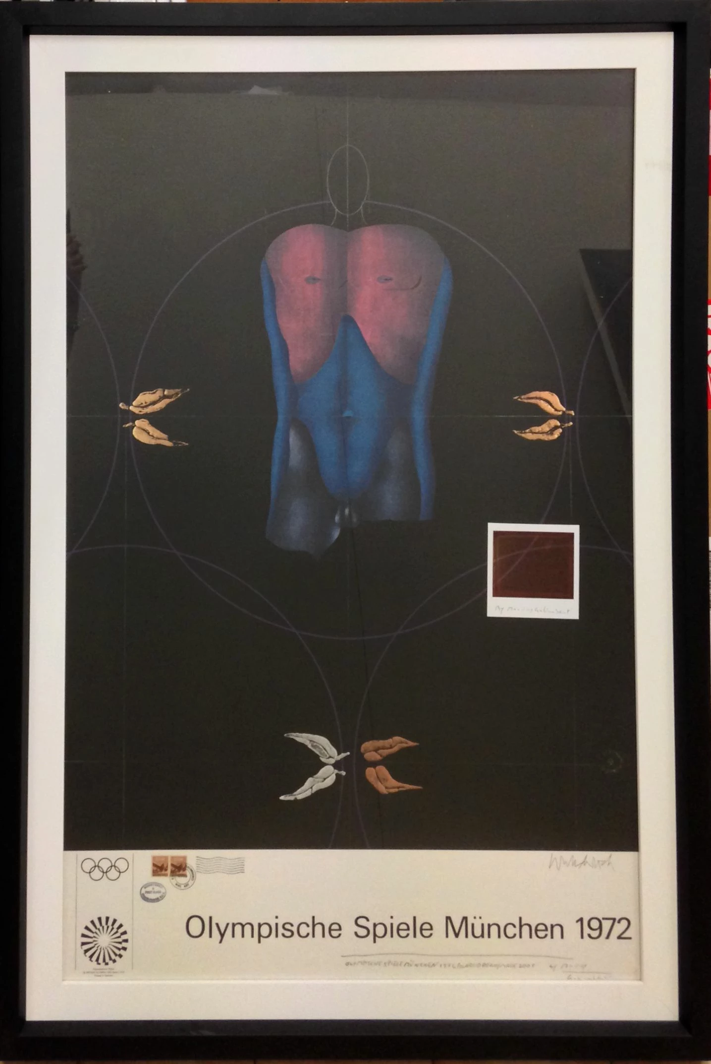 Quest’opera di Maurizio Galimberti è un pezzo unico che deriva dal ritocco di un manifesto originale di Paul Wunderlich dei Giochi Olimpici di Monaco del 1972. Galimberti interviene sul suo lavoro sovrapponendo all’immagine originale una polaroid che ritrae un dettaglio del manifesto stesso. L’opera è provvista di cornice nera.