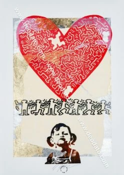 In questa bellissima opera unica l’artista Giuliano Grittini omaggia due dei più famosi street artist al mondo: Keith Haring e Banksy. Egli infatti rappresenta il soggetto della bambina di Banksy che guarda verso l’alto in direzione di un cuore rosso colmo di personaggi primitivi creati da Haring. Attraverso l’uso della “cracker art”, Grittini ripropone immagini di famose opere, icone o figure storiche attraverso varie tecniche tra cui ritagli, assemblaggi, collage, caratterizzati da colori accesi e inserti luminosi e glitterati. Opera unica, firmata in originale dall’artista e provvista del certificato di autenticità.