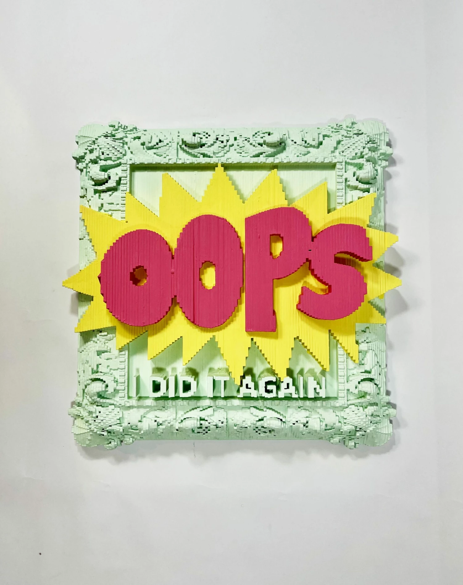 L’opera unica di Daniele Fortuna, Oops I Did It Again è una scultura da parete realizzata con pittura acrilica su legno.
