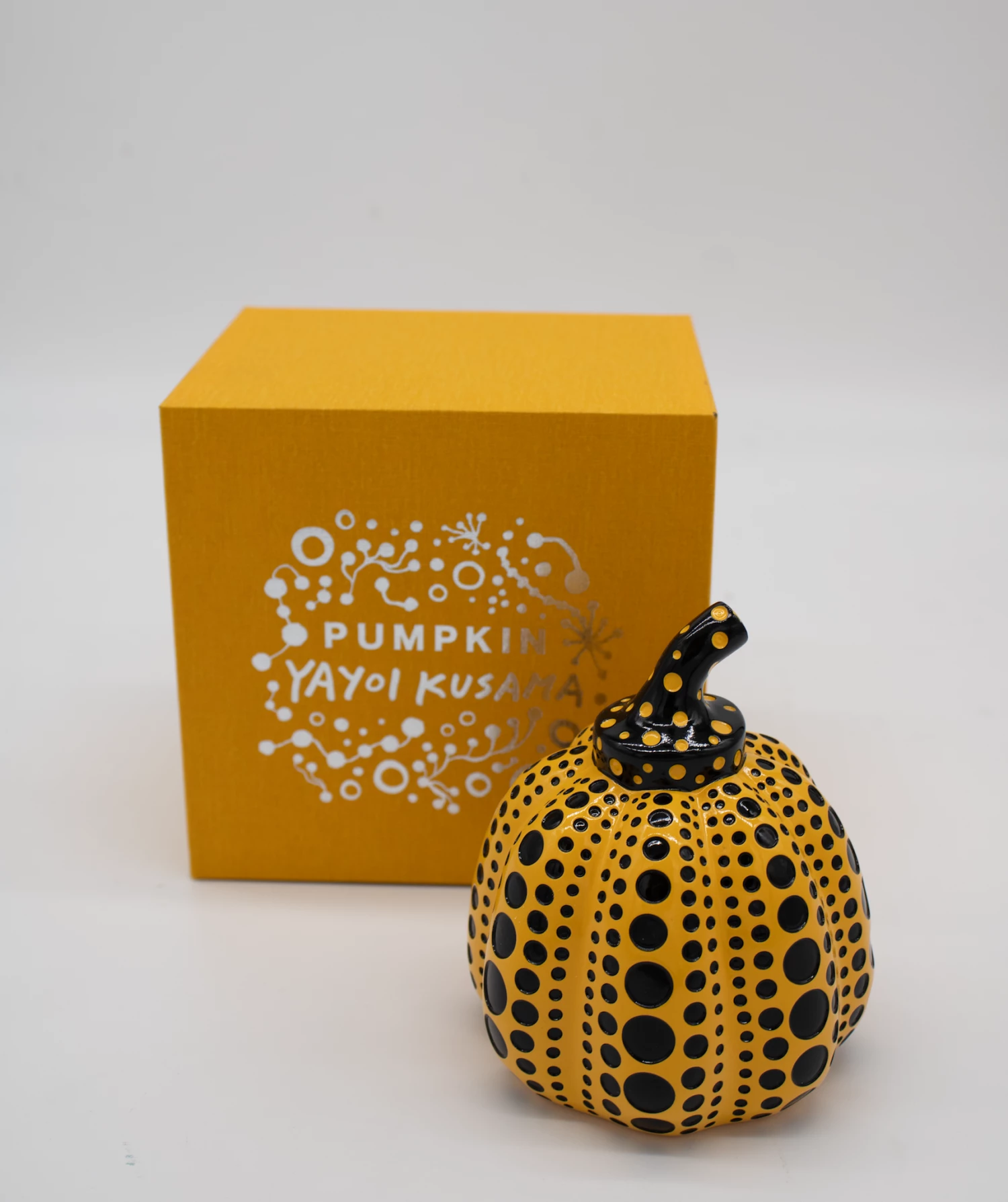 Original Pumpkin Ceramic Sculpture (Yellow & Black) è una scultura di Yayoi Kusama in ceramica e provvista della confezione originale.