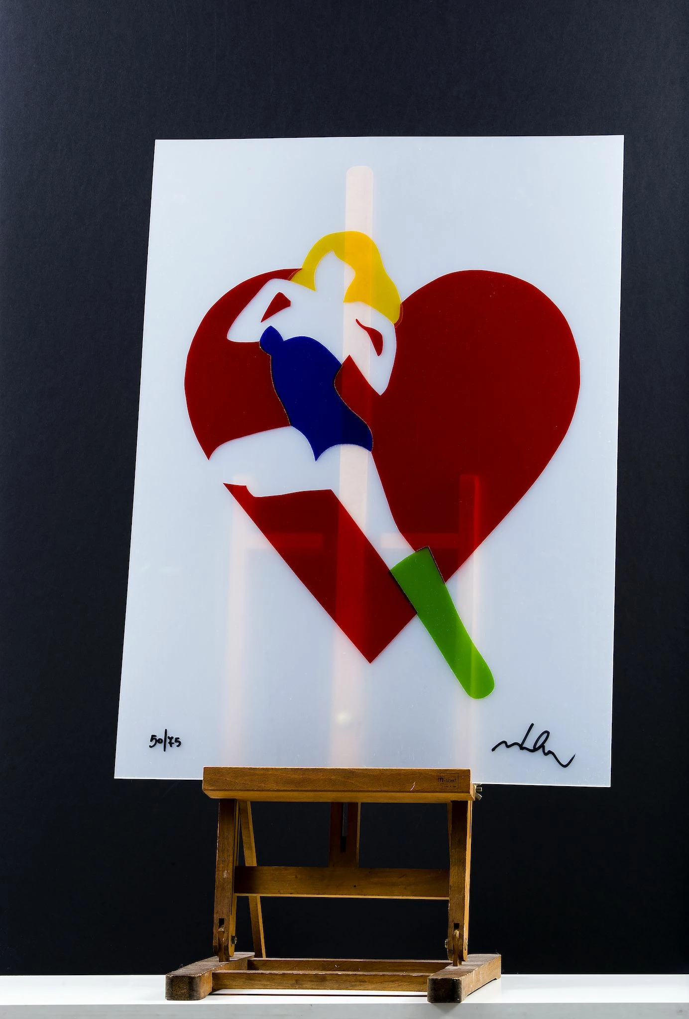 L’opera Pin Up Love di Marco Lodola misura 35×50 cm ed è un sericollage realizzato a mano su PVC.