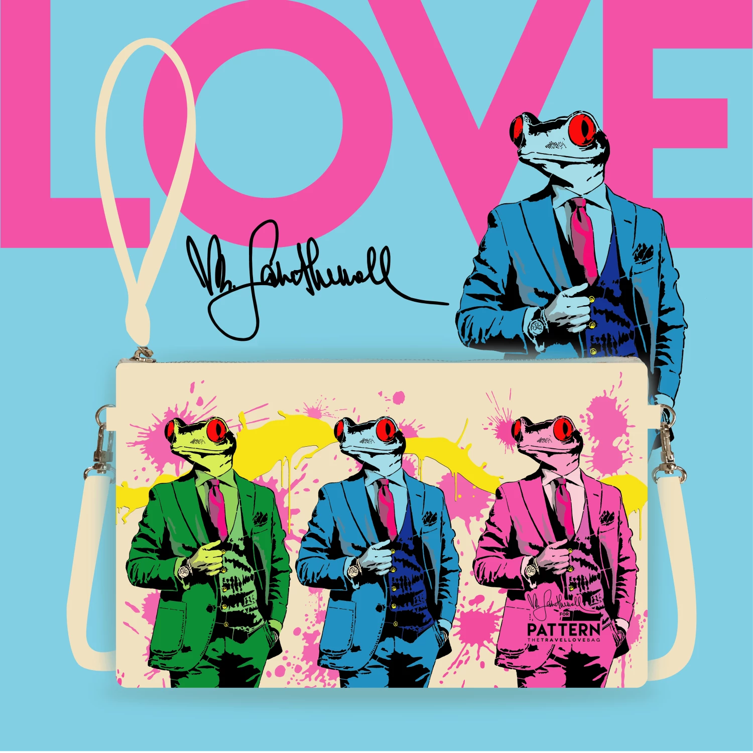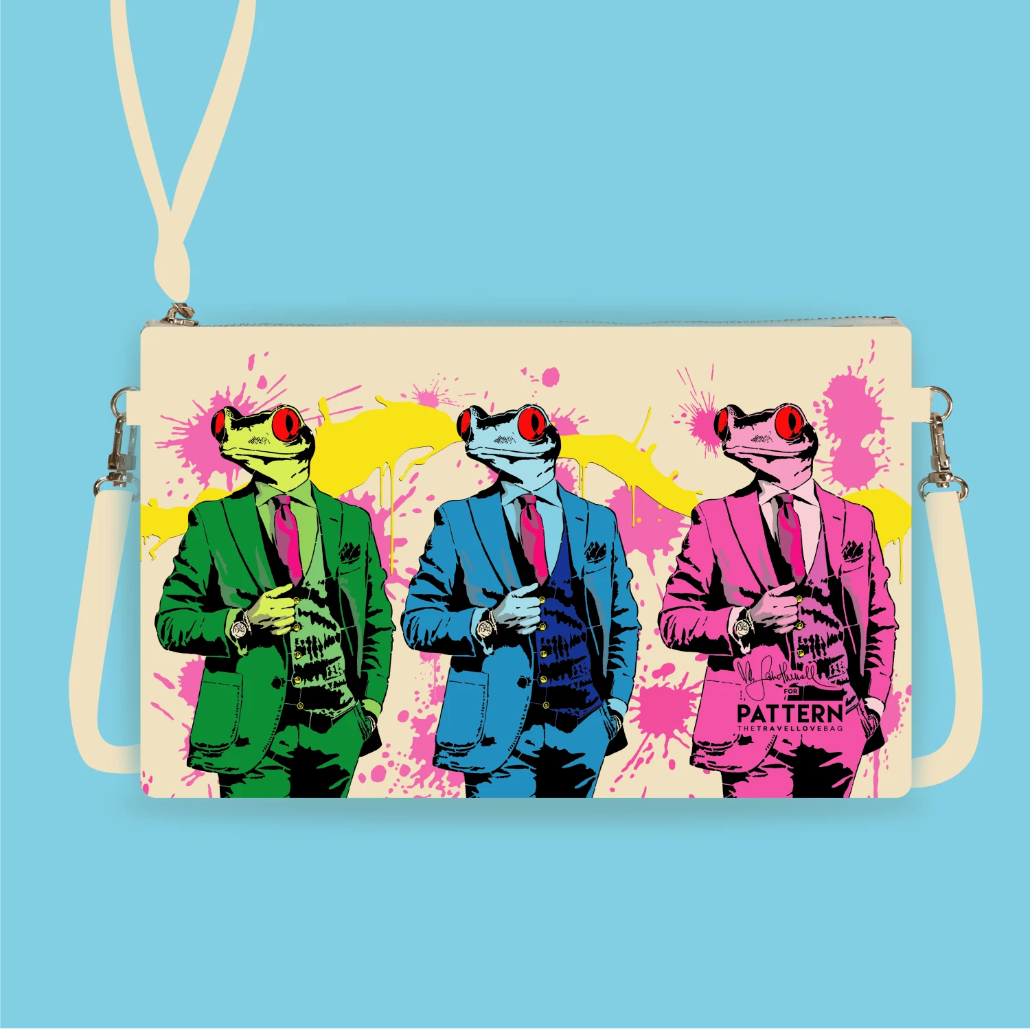 La pochette con tracolla stampata su pelle sintetica con design originale di Pattern-thetravellovebag per Mr Savethewall: la celebre opera “Kiss Me”.