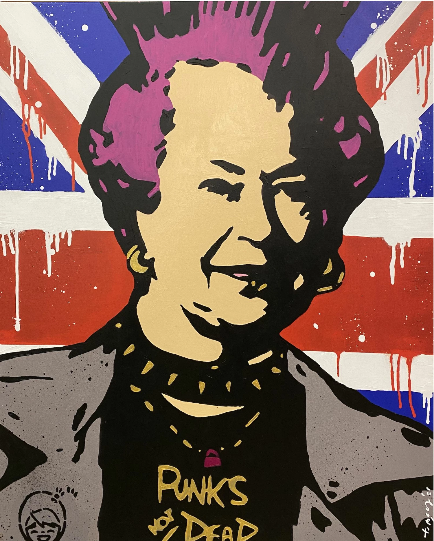 Opera unica di Tvboy, Punk Queen rappresenta la Regina Elisabetta in abiti e look da punk. Alle sue spalle troviamo la bandiera del Regno Unito realizzata con graffiti e colature di vernice mentre sulla maglietta della donna compare la scritta “Punk’s not dead”.