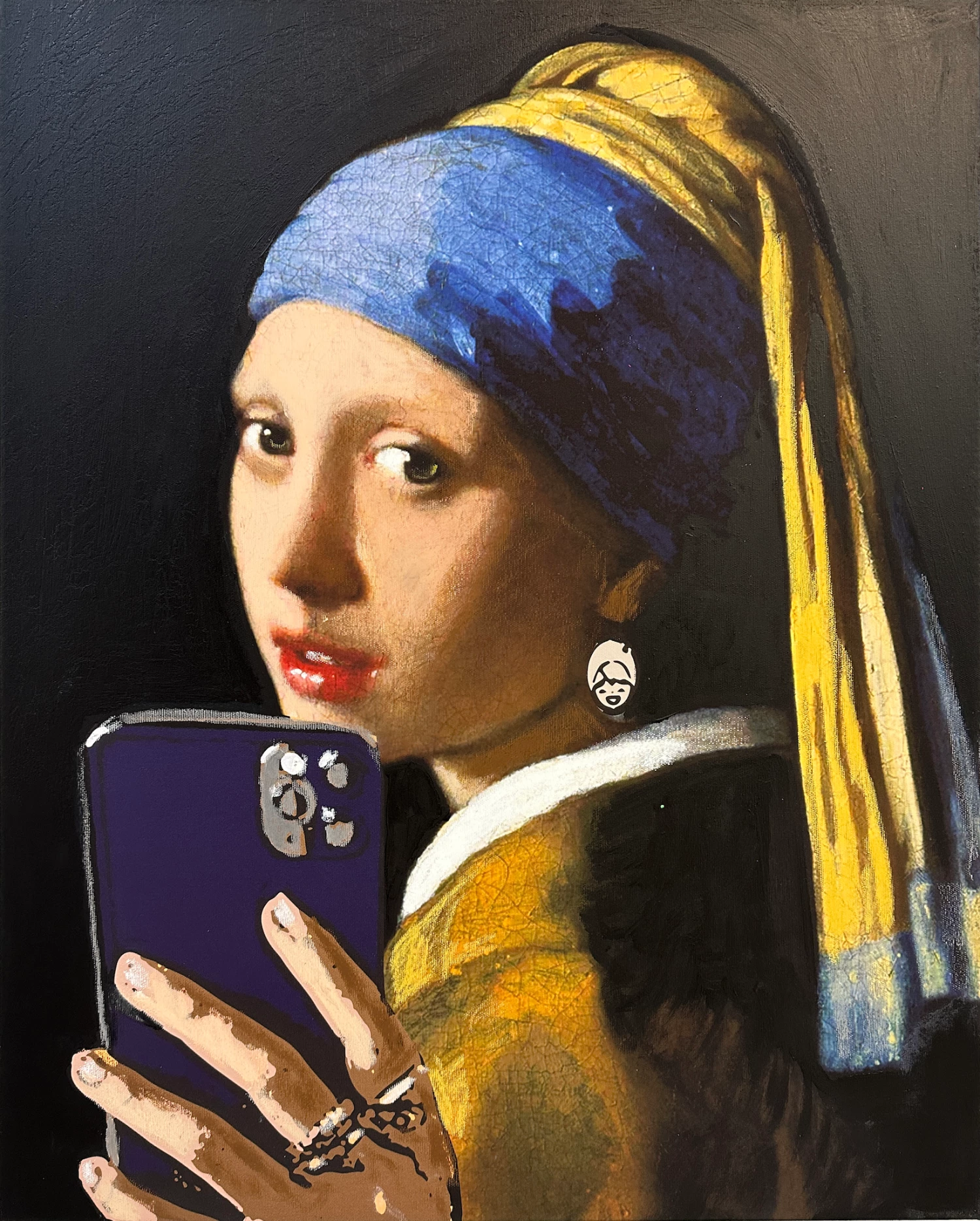 Opera unica di Tvboy, Ragazza con l’Orecchino rappresenta una riproduzione del noto dipinto di Johannes Vermeer Ragazza col turbante (1665-66), anche noto come Ragazza con l’orecchino di perla. La protagonista appare però intenta a scattarsi un selfie con il proprio smartphone, come davanti a uno specchio.