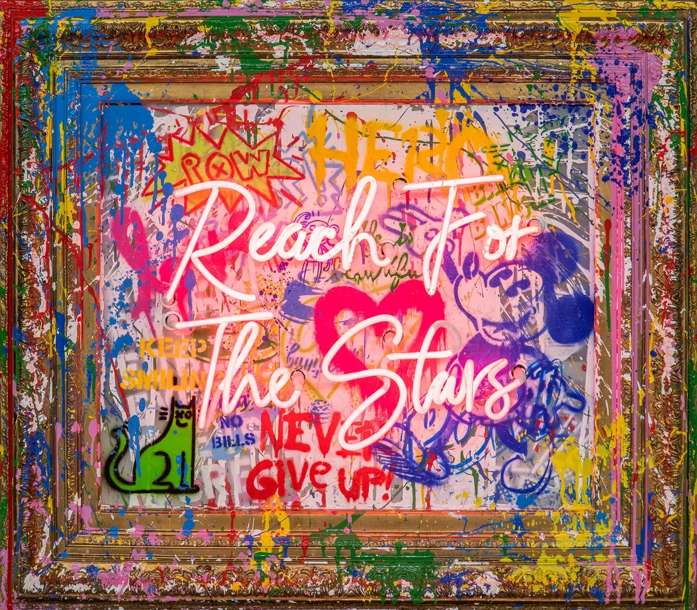 Opera unica su tela di Mr. Brainwash, Reach for the Stars rappresenta il motto del titolo con una scritta al neon che si staglia su uno sfondo ricco di colori e di riferimenti Pop.