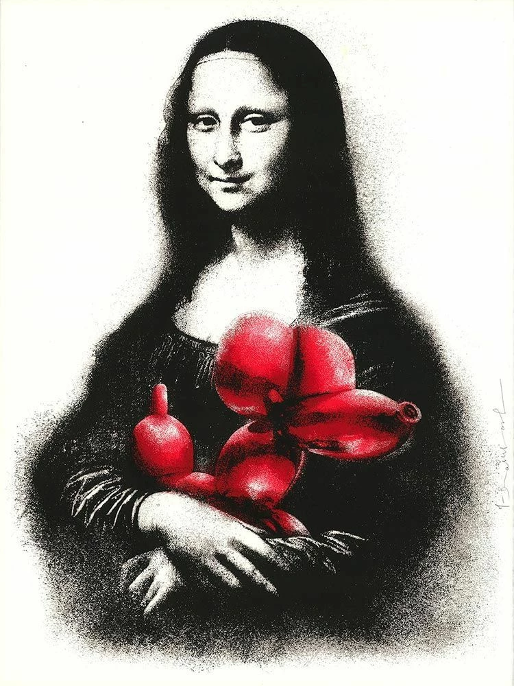 L’artista francese naturalizzato statunitense diversifica le diverse edizioni cambiando il colore del Balloon Dog di Jeff Koons – disponibile in blu, rosa e rosso – che un’eterna Monna Lisatiene in braccio come fosse un cucciolo.
