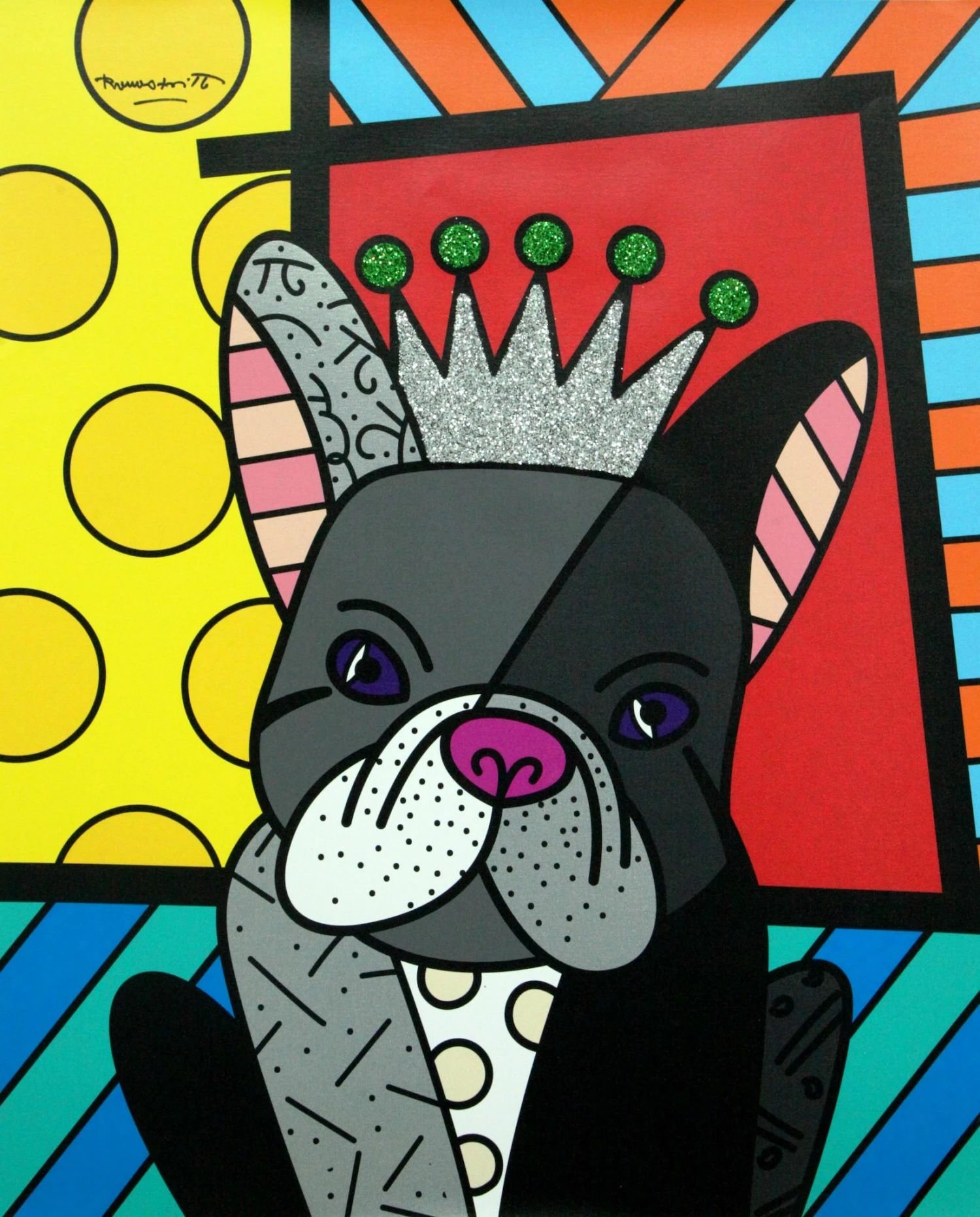 Ancora una volta un dolce cagnolino occupa il ruolo centrare nell’opera di Romero Britto: “Royalty“, serigrafia digitale impreziosita dalla polvere di diamanti, ha come soggetto un bulldog francese.