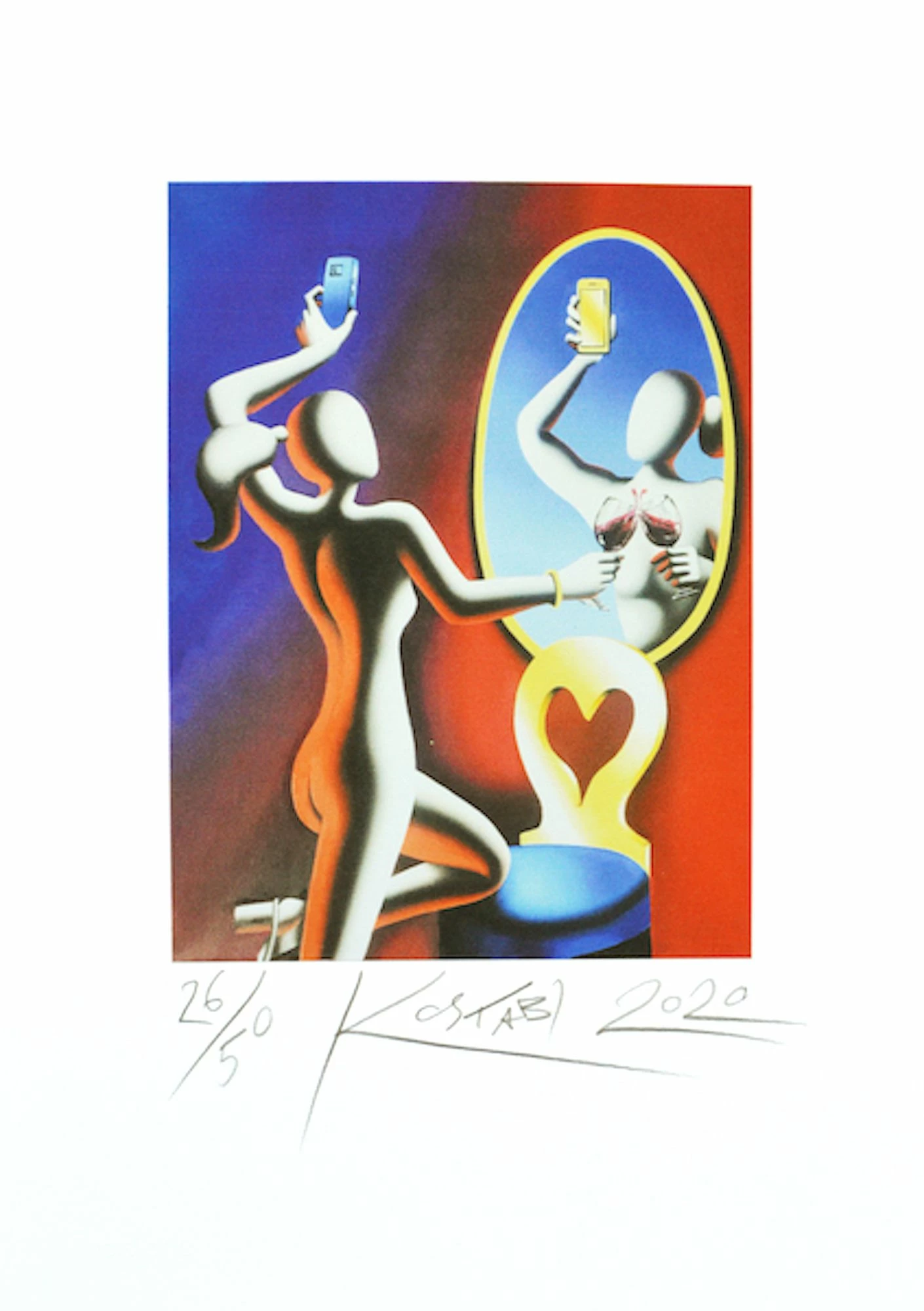 Serigrafia in edizione limitata di Mark Kostabi, Selfie Actualized mostra una sagoma femminile mentre con un bicchiere di vino in mano si scatta un selfie allo specchio.
