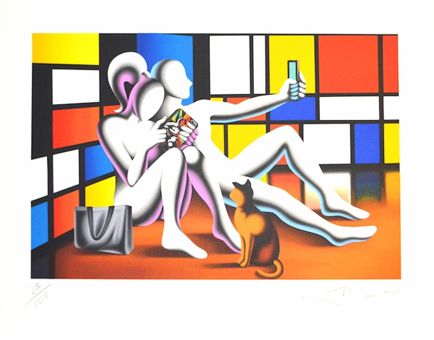 Serigrafia in edizione limitata di Mark Kostabi, Social Modernism mostra due amanti seduti a terra, lei con in mano quello che sembra essere un tablet, lui intento a scattare un selfie con il telefonino.