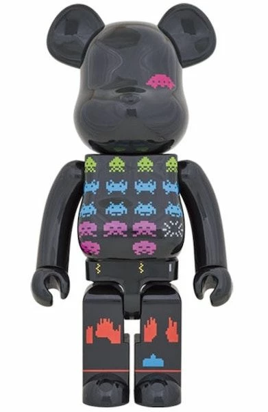 L’art toy, nella forma classica ed iconica del Bearbrick, è decorato con il motivo che riprende il famoso gioco del 1978, Space Invaders.