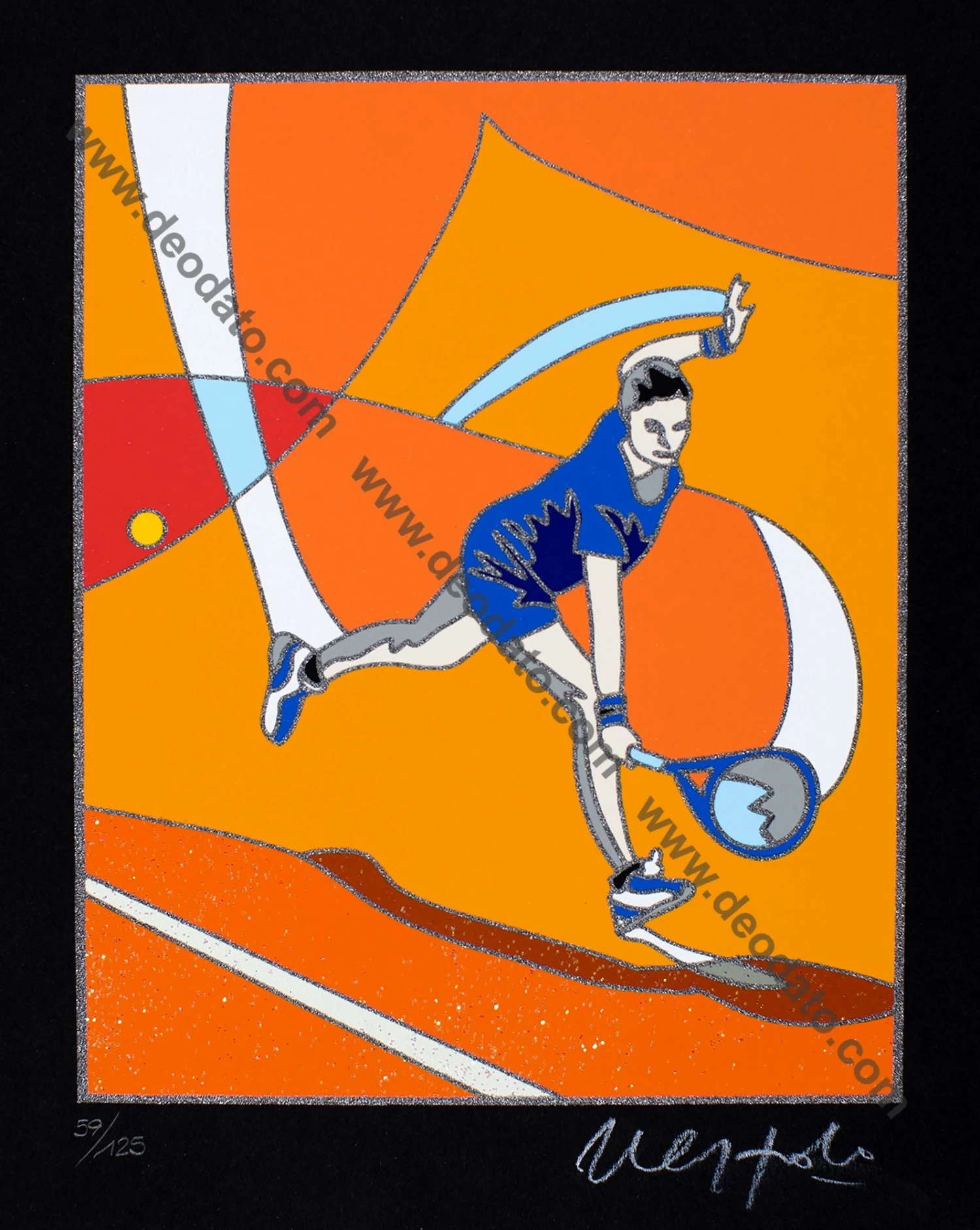 In questa bellissima serigrafia del Pittore Ugo Nespolo viene rappresentato su uno sfondo rosso e arancione una tennista intenta a colpire una pallina. Il soggetto è enfatizzato grazie l’aggiunta di brillantini e glitter che conferiscono luminosità all’opera.