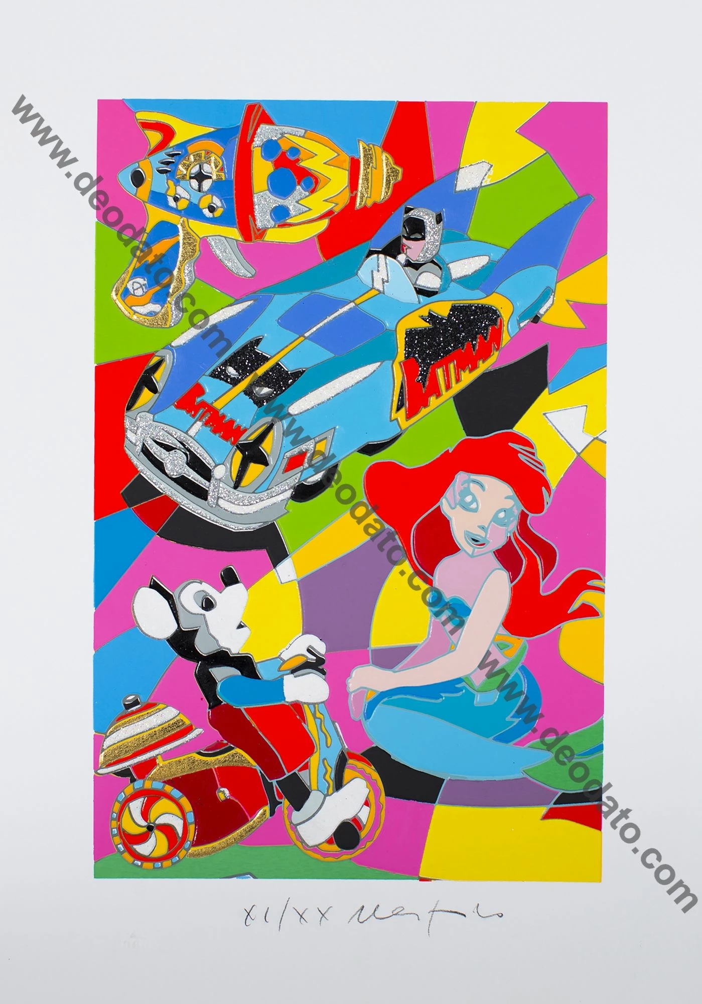 Splendida serigrafia di Ugo Nespolo, che con la sua inconfondibile tecnica di sintesi pittorica e formale, rappresenta i più famosi personaggi dell’universo cartoon, come la Sirenetta e Batman.