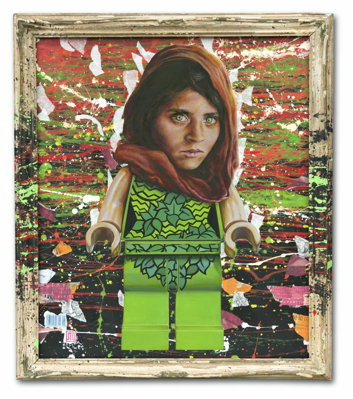 Nell’opera unica retouché The eyes of Sharbat Gula di José Molina, il volto di Sharbat Gula completa il corpo di un Lego. Il risultato è un’eroina contemporanea, parte della serie A Hero Never Dies.