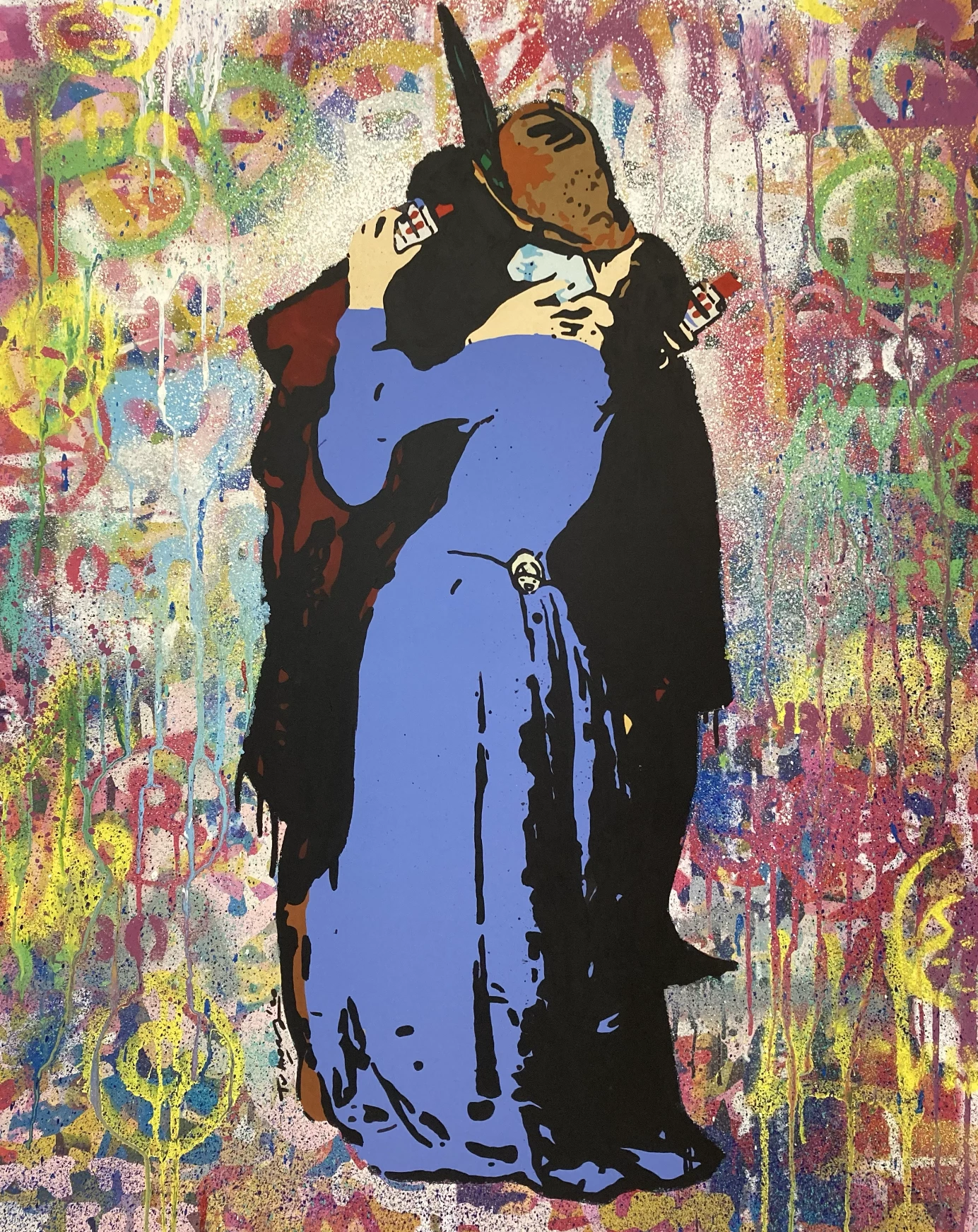 The influencer’s Kiss Graffiti Wall è realizzato con una tecnica mista su tela: per i bordi Tvboy utilizza la tecnica dello stencil, mentre l’interno è dipinto a mano con pittura ad olio. L’opera misura 100×80 cm ed è firmata in originale dall’artista.