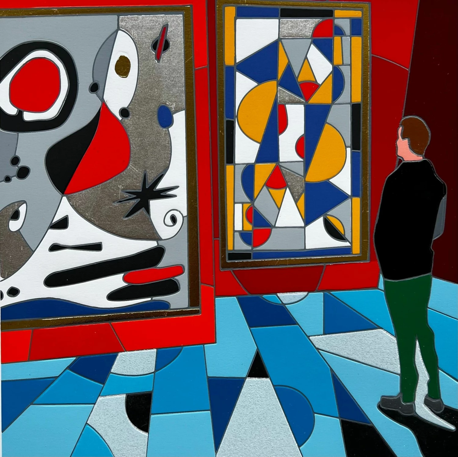 L’opera rappresenta un uomo che dà le spalle all’osservatore per ammirare due quadri appesi alle pareti di un museo. Nespolo è solito usare delle citazioni nelle sue opere, come in questo caso il richiamo a Mirò.