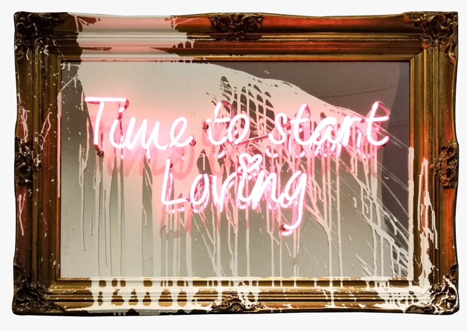 La scritta “Time to start loving” è stata realizzata grazie all’abilità dell’artista nel modellare una lampada a neon fino a formarne la frase posta su uno specchio, il quale riflette la luce tenue e rosa della scritta. Lo street artist dà, inoltre, un tocco pop e contemporaneo con degli schizzi di vernice che sono poste sullo specchio e sulla cornice.