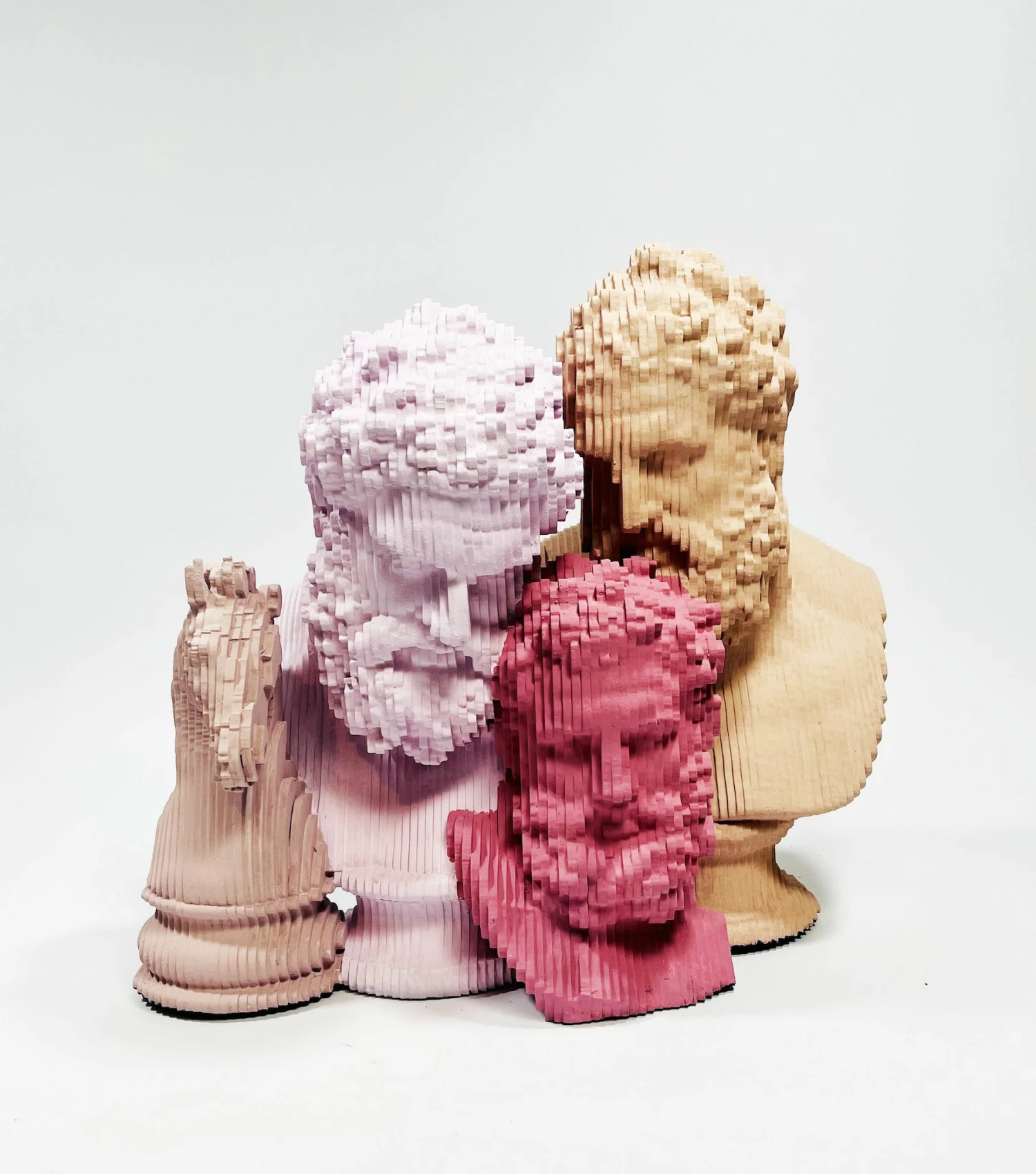Le sculture di Fortuna hanno come punto di partenza soggetti classici, busti greco-romani che vengono ricreati in legno, con una tecnica che accosta più livelli sfalsati, ricordando quasi una riproduzione digitale.