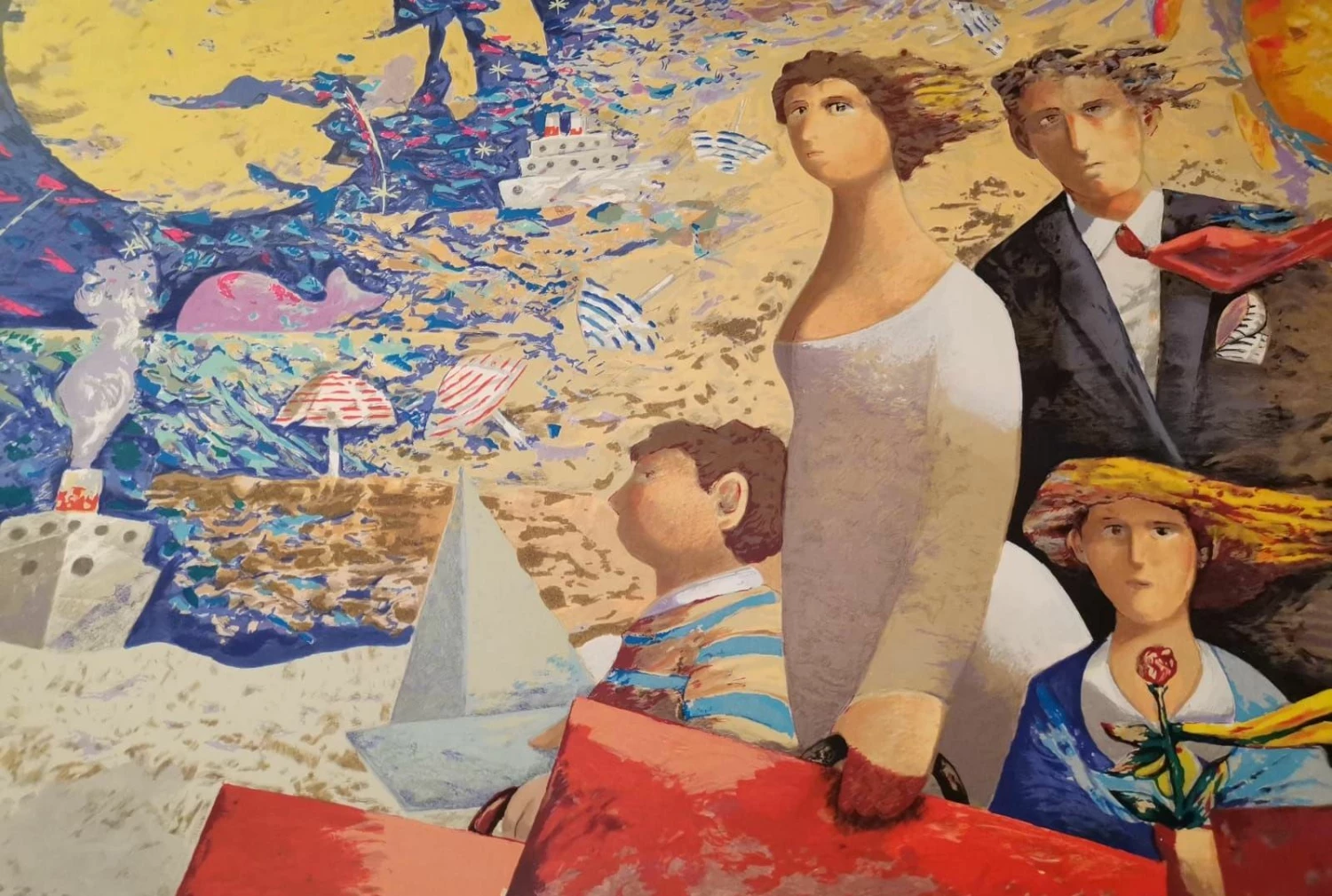 Serigrafia polimaterica di Giampaolo Talani, Un Grande Viaggio rappresenta una famiglia in partenza nello stile sospeso e poetico tipico dell’artista.