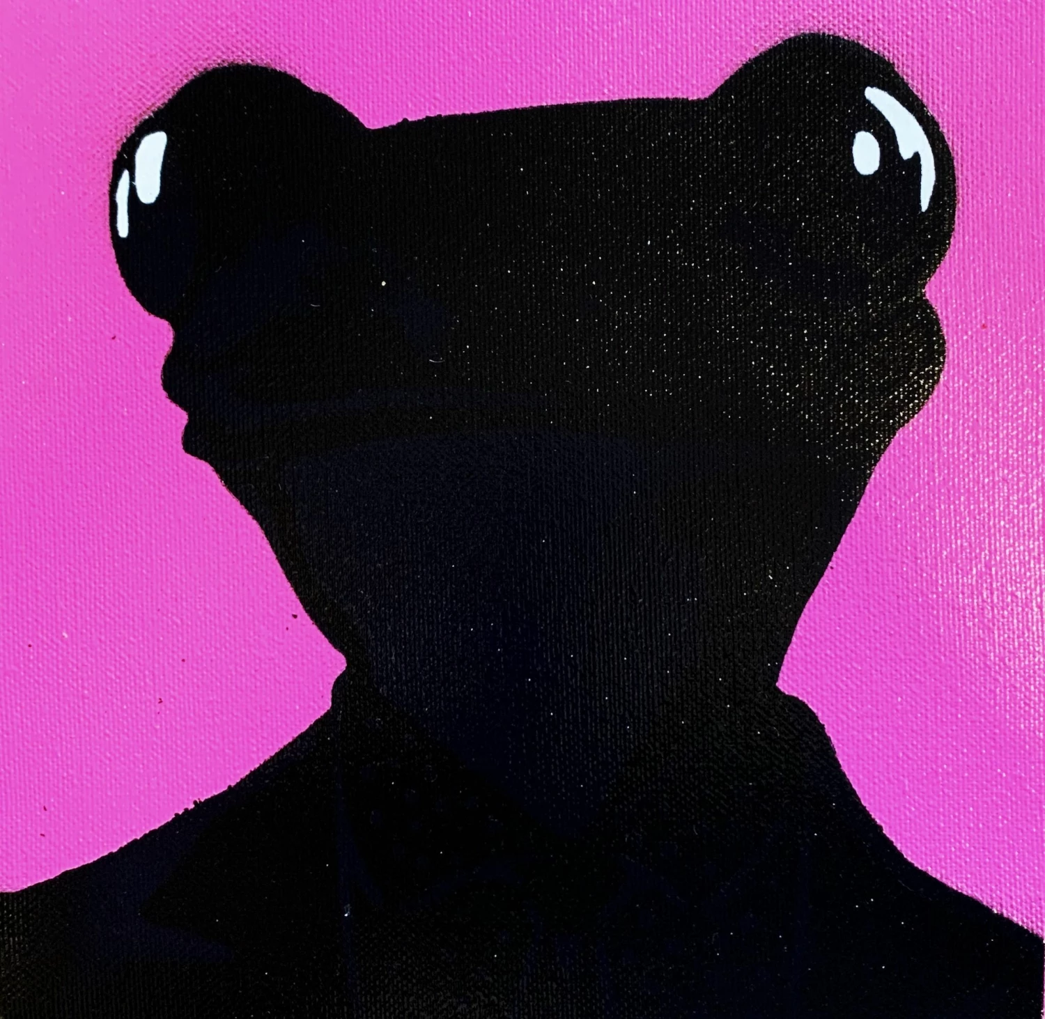 Il ranocchio, soggetto iconico antropomorfo e solitamente rappresentato con giacca e cravatta, viene qui rappresentato soltanto tramite una sagoma nera. Il colore monocromatico fa da sfondo alla sagoma del ranocchio protagonista della celebre serie Kiss Me.