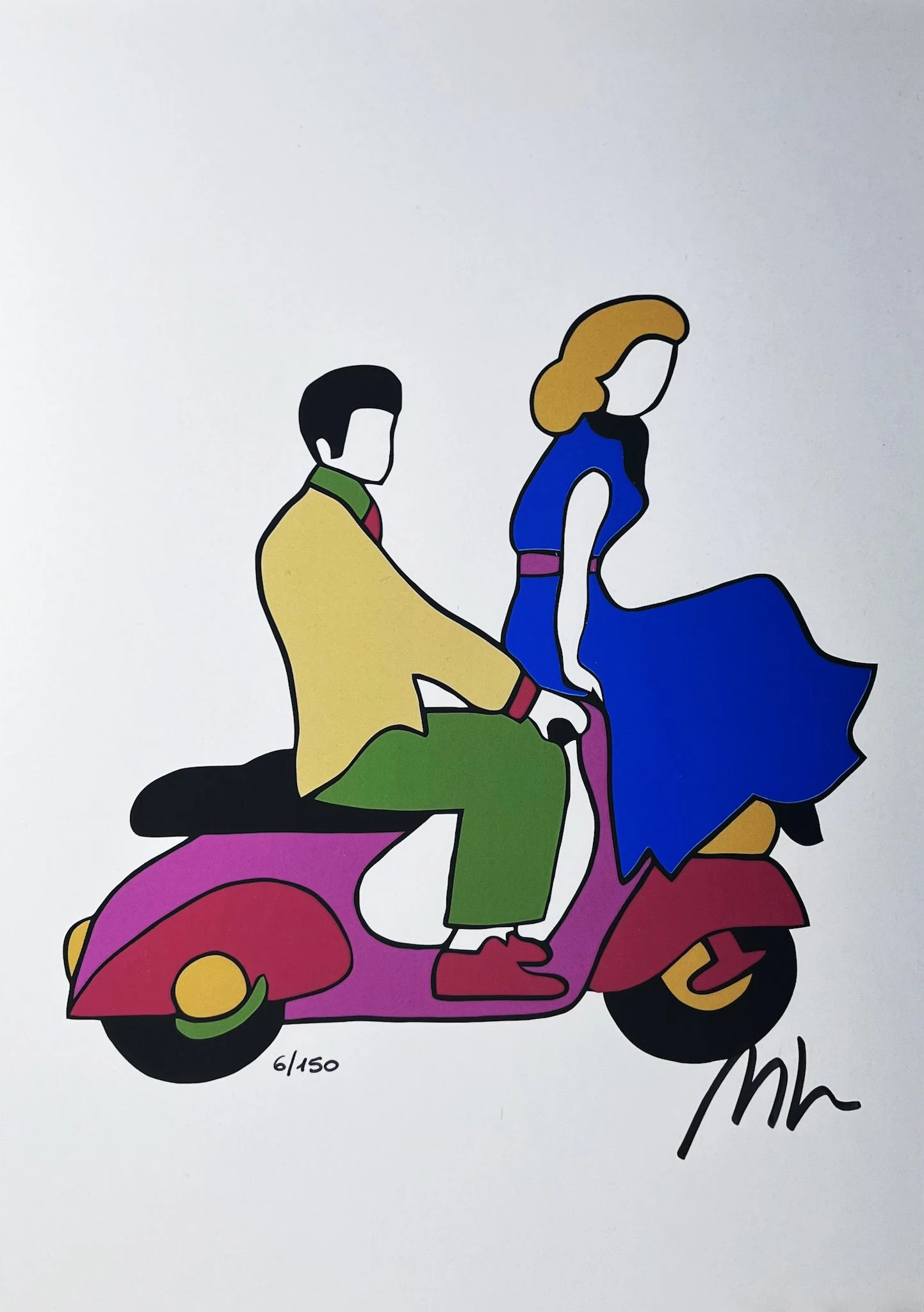 Serigrafia di Marco Lodola, Vacanze Romane rappresenta una coppia di innamorati a bordo di una colorata Vespa.