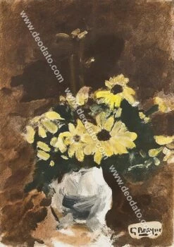 In questa bellissima incisione Geoges Braque rappresenta attraverso l’uso di segni veloci e colori caldi un bellissimo vaso di piccoli fiori gialli. Il colore bianco del vaso è nettamente in contrasto con lo sfondo marrone scuro. Una parte consistente della produzione artistica di Braque si incentrò soprattutto sulle nature morte, affrontate secondo una nuova visione e secondo molteplici prospettive e punti di vista coesistenti.