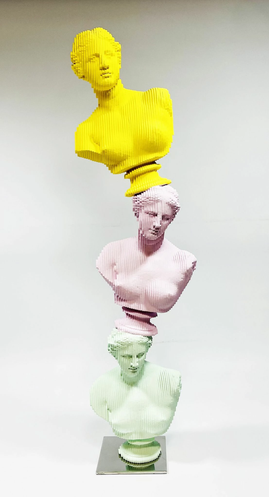 Soggetto dell’opera sono tre teste ispirate alla nota Venere di Milo. I tre volti sono posti uno sopra l’altro con tre diverse prospettive e colori. La scelta cromatica che l’artista fa per l’opera, ovvero quella di usare delle tonalità di colori che non siamo soliti vedere nelle opere classiche, è dovuta al desiderio di Daniele Fortuna di creare una sorta di ponte immaginario tra il passato e il presente all’interno delle sue opere.