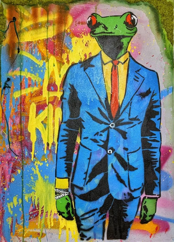 Ma non solo: come anticipato, l’artista non rimane superficiale alle sue interpretazioni. L’uomo-ranocchio diventa così anche una raffigurazione dei suoi conoscenti, persone reali, che si atteggiano mostrando il Rolex e girando ben vestiti. In realtà, al di sotto dell’apparenza che spesso inganna, queste persone si dimostrano per quello che sono realmente: dei ranocchi.