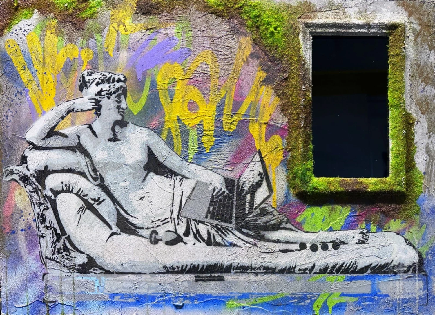 Protagonista dell’opera è una scultura di Canova rivisitata in perfetto stile Mr. Savethewall. L’artista, infatti, riprende la scultura realizzata dall’artista del neoclassicismo dal titolo Paolina Borghese come Venere vincitrice. Mr. Savethewall trasporta il soggetto all’interno della nostra epoca, raffigurandola con un computer.