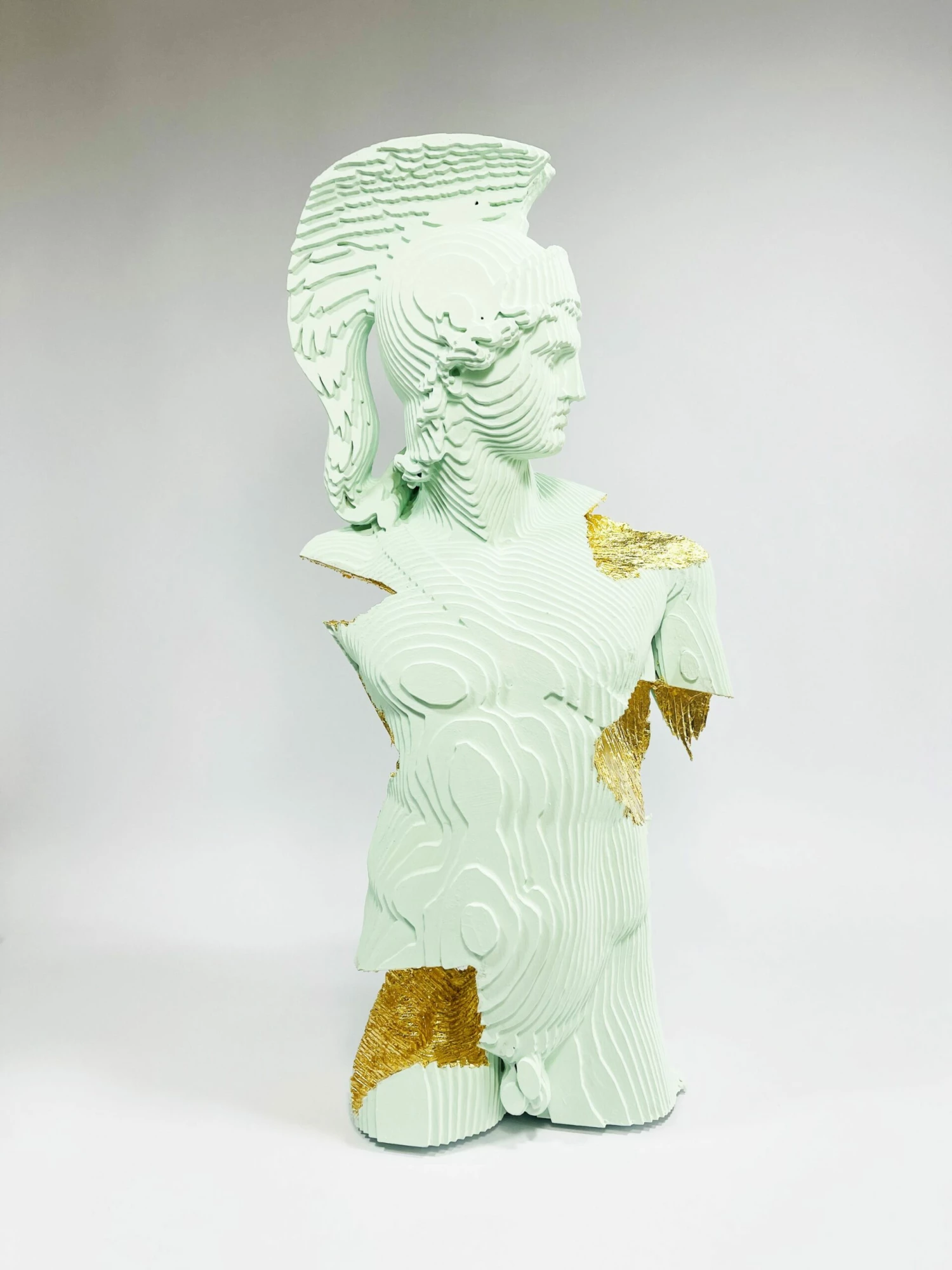 La scultura riprende le forme tipiche delle sculture dell’antichità. La scelta di riprendere dei volti che rispecchiano i canoni estetici antichi ma dipinti con colori luminosi caratterizza la produzione artistica di Daniele Fortuna. L’artista ha coniato il termine Colormination, qui divenuto Goldenmination, proprio per indicare la contaminazione cromatica, che in questo caso è l’oro, nelle sue opere fortemente ispirate ai grandi classici del passato.