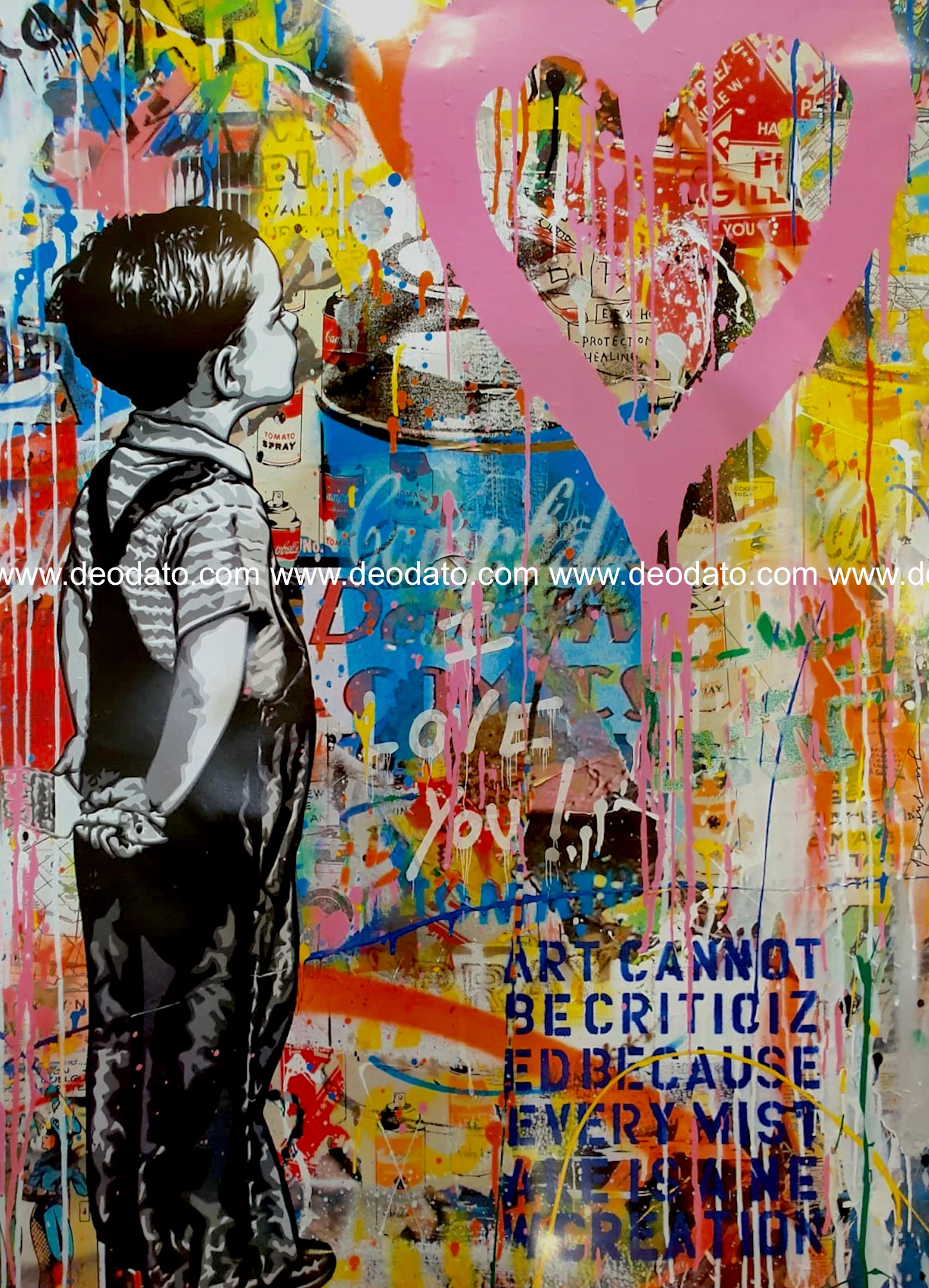 L’opera è una dedica dell’artista: il cuore rosa che il piccolo bambino sta guardando è simbolo dell’amore e della passione con cui Mr. Brainwash crea le sue opere destinate al suo pubblico.