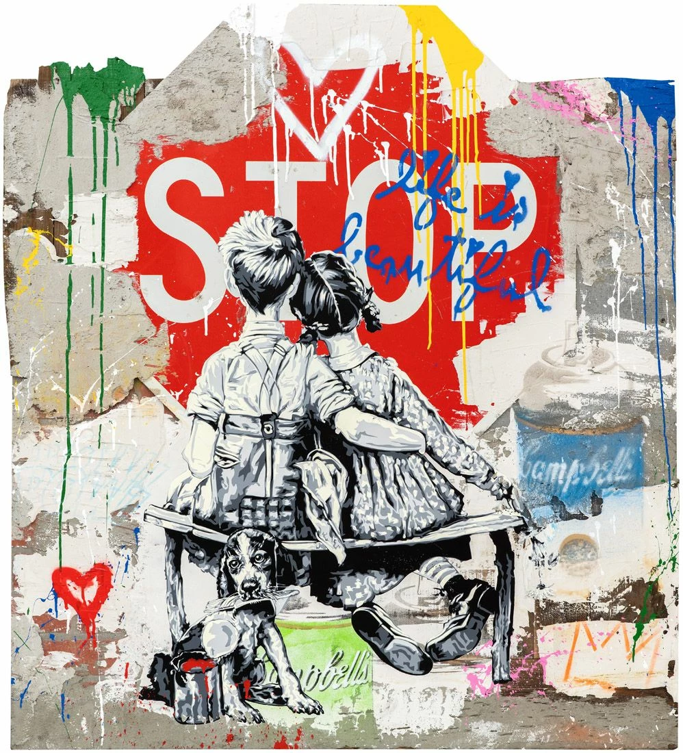 L’opera unica di Mr. Brainwash, Work Well Together è un intervento su cartello stradale realizzato nel 2023.