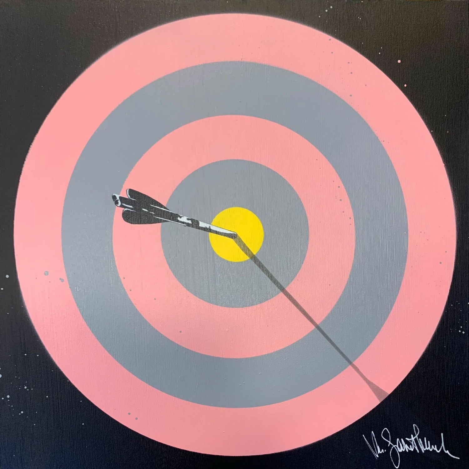 Protagonista dell’opera di Mr. Savethewall è un besaglio realizzatonei toni del rosa e del grigio che emerge su uno sfondo completamente nero. Proprio al centro del bersaglio, l’unico punto coloranto con un giallo brillante dell’opera, c’è una freccetta. L’opera realizzata in tecnica mista su tela ha un’importante significato per Mr. Savethewall che identifica la freccetta al centro del bersaglio, nel punto colorato, come un obbiettivo prefissato e raggiunto o un sogno realizzato.