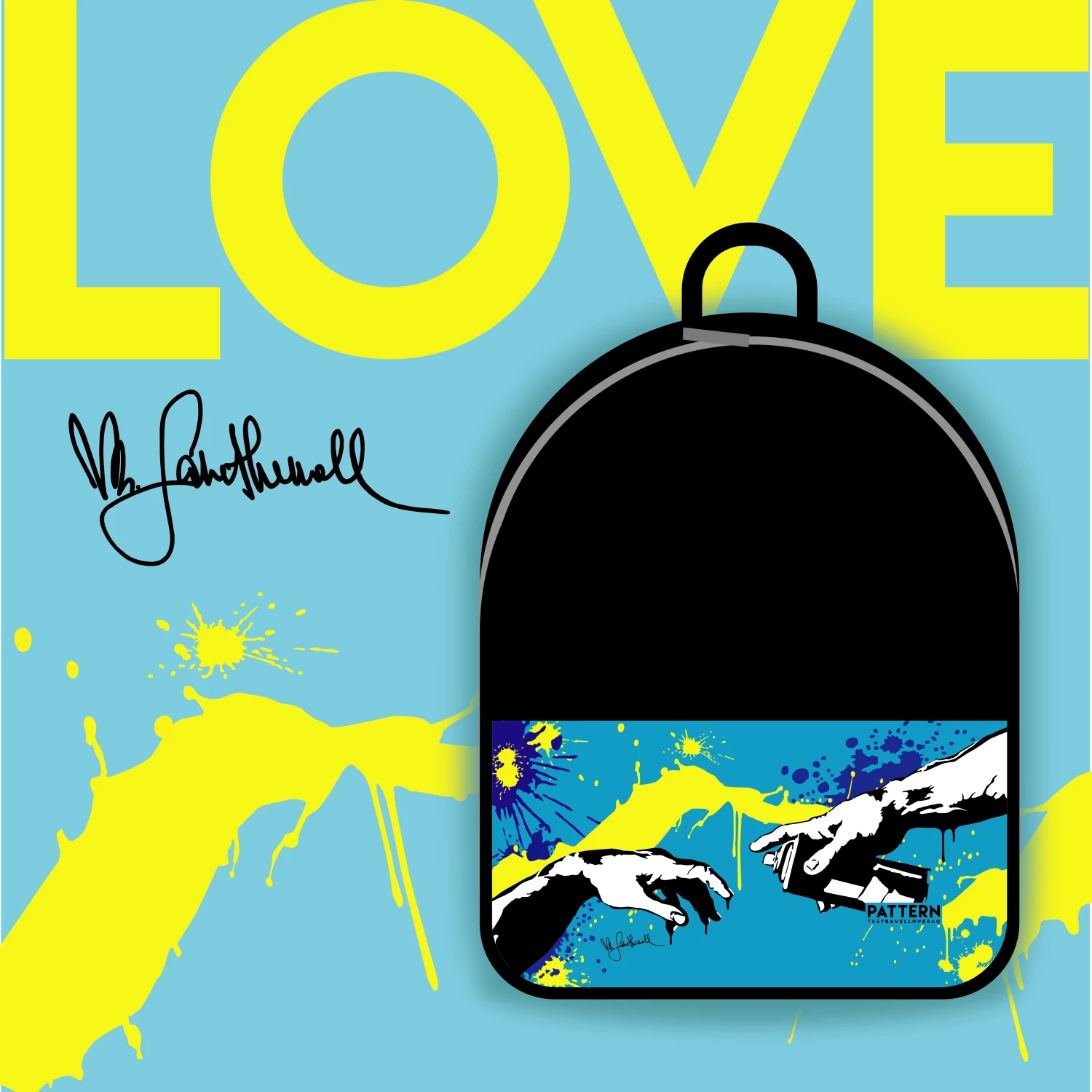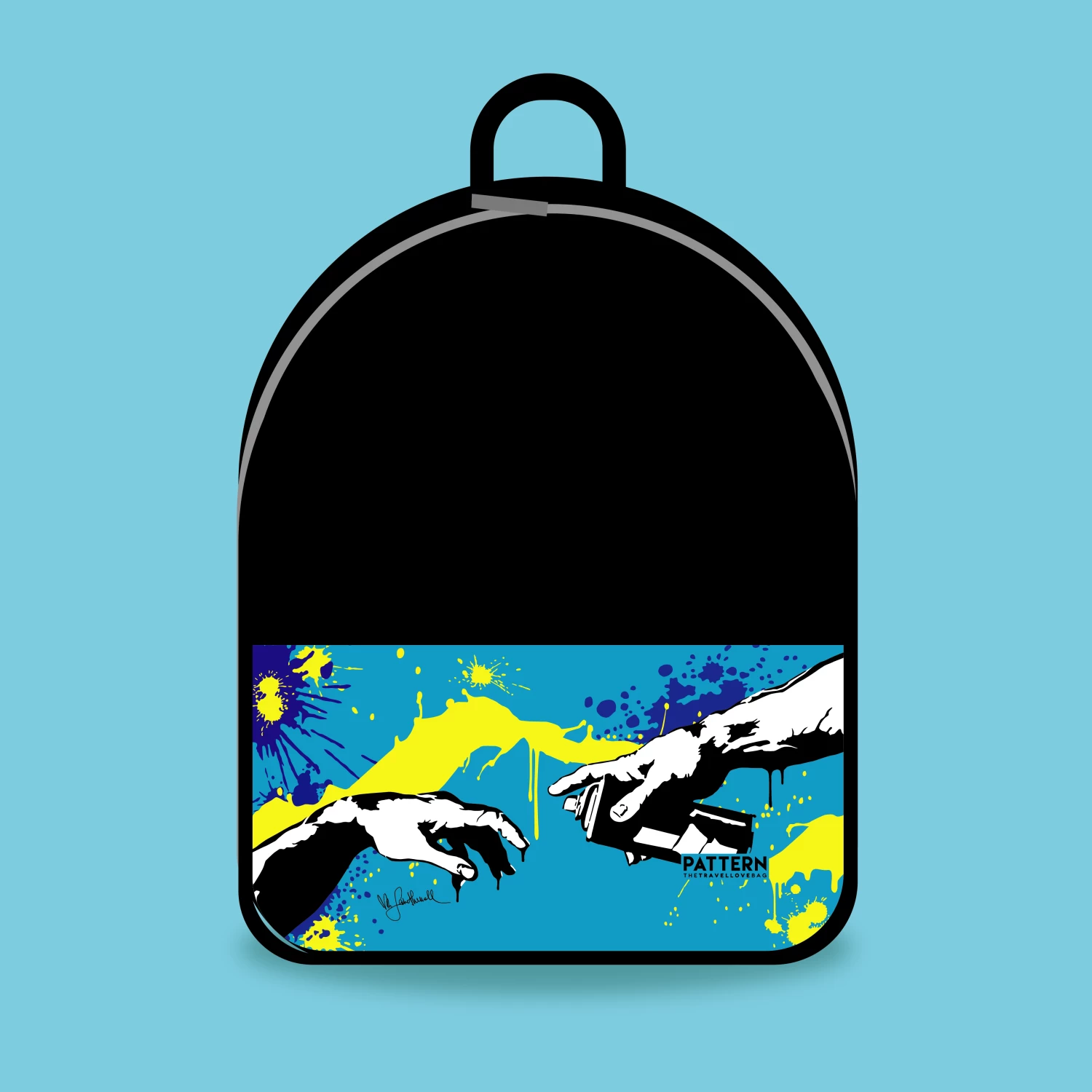 Lo zaino Made in italy, nero con ampia tasca stampata su pelle sintetica con il dettaglio inconfondibile della celebre opera di Mr Savethewall “God Save the wall”. Internamente foderato è provvisto di spallacci regolabili.