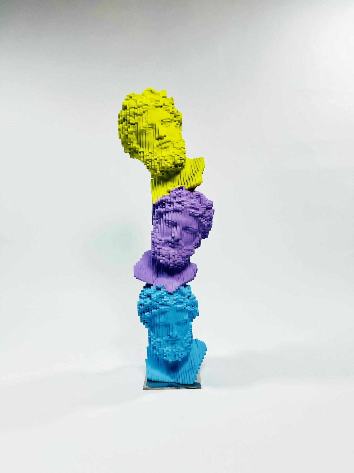 La scultura riprende dei volti tipici delle sculture dell’antichità. Essi sono posti con tre diverse prospettive e hanno colori differenti e sono posti uno di fianco all’altro.