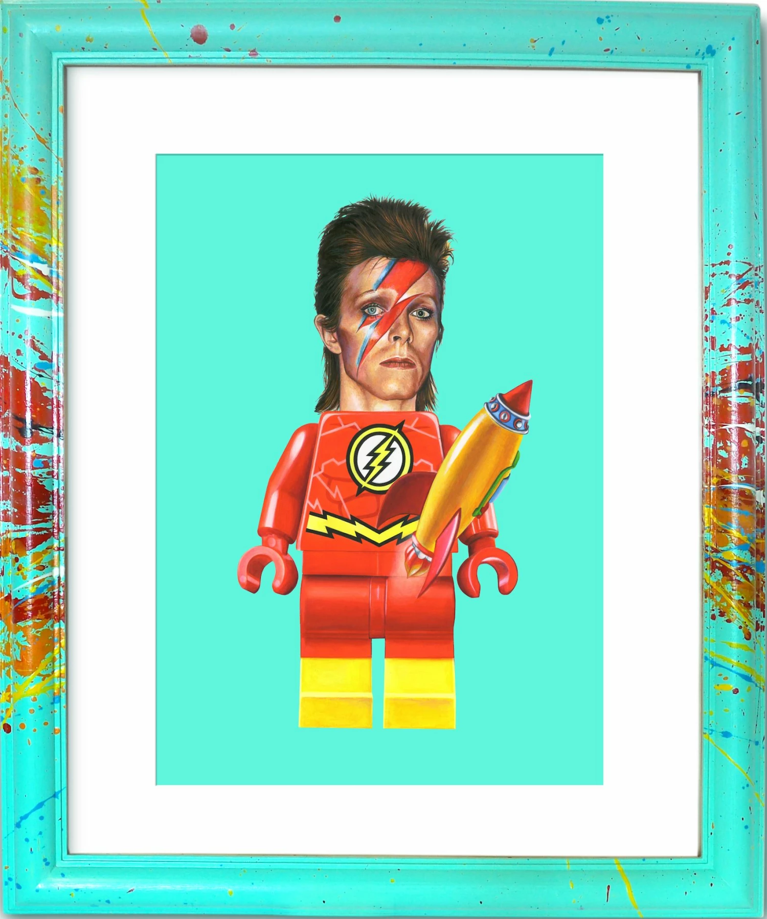 Lo sfondo azzurro di quest’opera contrasta con il rosso brillante della tuta di Flash (noto supereroe dell’Universo DC), che ha l’iconico logo a forma di saetta sul petto, che indica la sua inarrivabile velocità. Questo simbolo è stato ripreso dal David Bowie stesso come trucco sul suo volto.